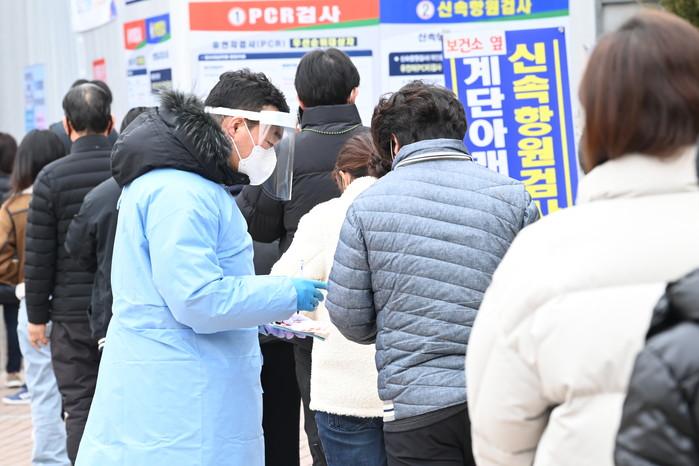 경기 하남시가 오미크론 대규모 확산에 따라 시민편의를 돕고 보건인력들의 업무부담을 경감하기 위해 오는 4월까지 56명의 국·과장급 간부공무원을 포함한 전직원이 번갈아 휴일에도 나와 선별검사소 업무를 지원하는 등 코로나19 대응에 모든 행정역량을 동원하고 있다. 사진은 최근 시 직원이 선별진료소 업무를 지원하고 있는 모습. (사진제공=하남시청)
