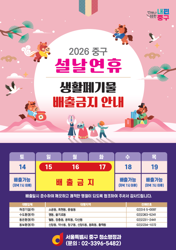 [시민일보 = 여영준 기자] 서울 중구가 설 연휴 동안 주민 불편을 최소화하기 위해 특별 청소대책을 추진한다. 구는 연휴 기간에 청소상황실을 운영하고, 오는 15일부터 17일까지 쓰레기 배출을 금지한다.