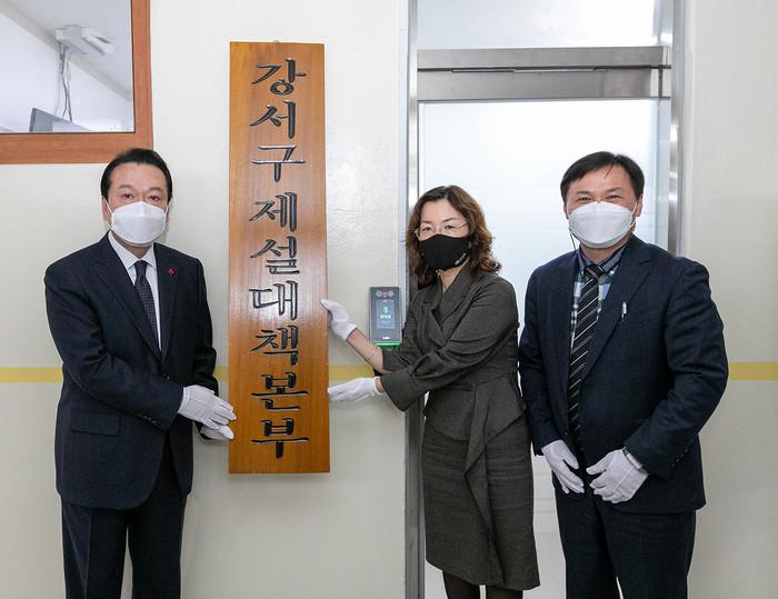 노현송 서울 강서구청장은 지난 15일 제설대책본부 발대식을 열고 제설대책 준비상황을 최종 점검했다. 제설대책본부는 오는 2022년 3월15일까지 4개월간 24시간 비상근무체제에 들어간다. 사진은 노 구청장(왼쪽)이 제설대책본부 현판을 들어보이고 있는 모습. (사진제공=강서구청)