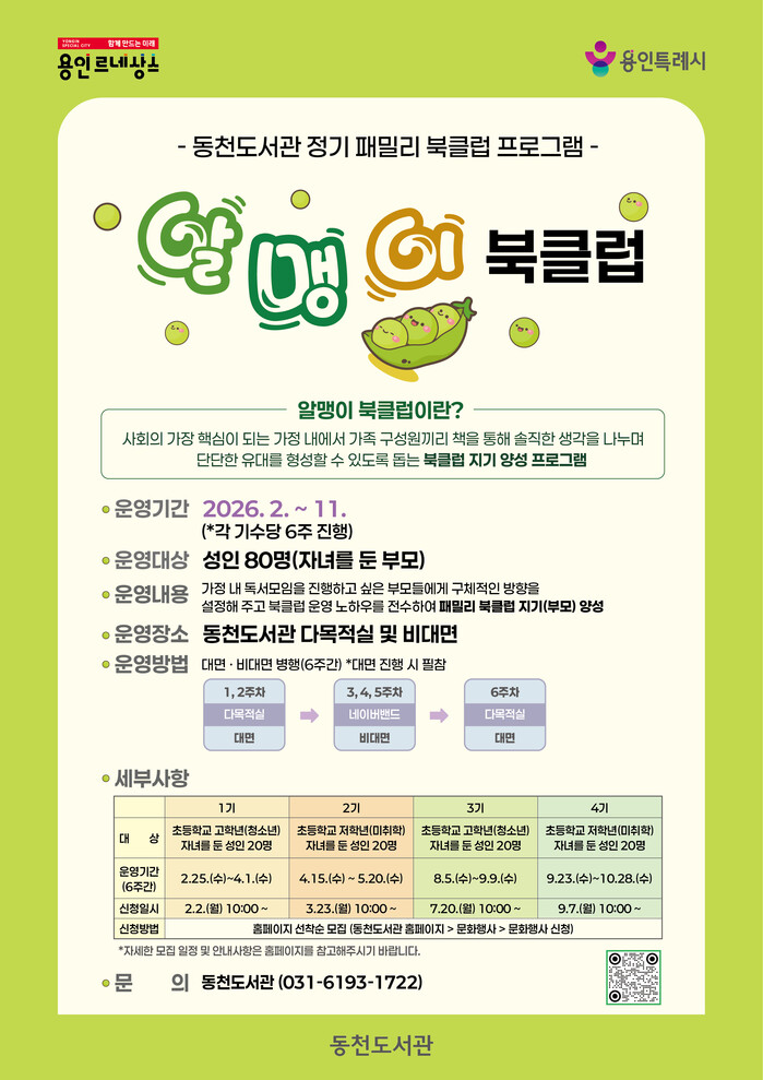 [용인=오왕석 기자] 용인특례시(시장 이상일) 동천도서관은 오는 2월 2일부터 선착순으로 ‘알맹이 북클럽’ 참가자를 모집한다고 26일 밝혔다.