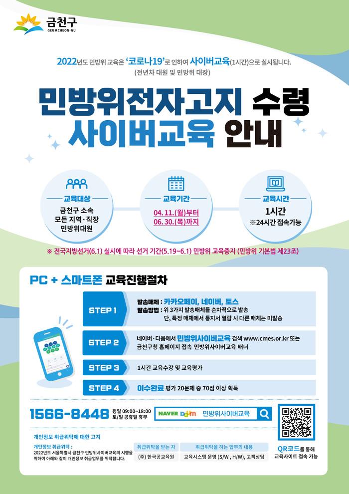 [시민일보 = 여영준 기자] 서울 금천구(구청장 유성훈)는 오는 11일부터 ‘2022년 민방위 교육훈련’을 비대면 사이버교육을 실시한다고 밝혔다.