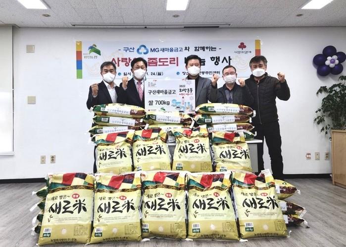은평구 구산동이 최근 구산동새마을금고로부터 어려운 이웃들을 위한 쌀 700kg을 기탁받았다. 사진은 쌀 기탁 후 기념촬영을 하고 있는 구산동새마을금고 관계자들의 모습. (사진제공=은평구청)