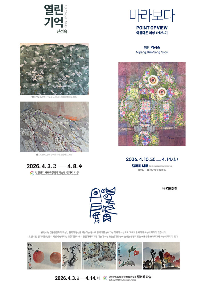 전시는 인천 시민을 대상으로 4월 3일부터 14일까지 주중(월~금) 오전 10시부터 오후 6시까지 무료로 운영되며, 자세한 사항은 평생학습관 누리집을 확인하거나 기획정보부 문화예술팀으로 문의하면 된다.