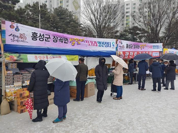 충남 홍성군 장곡면은 지난 19~20일 자매결연 도시인 서울 양천구 신정6동 양천공원에서 설맞이 도·농 직거래장터를 열고 채소·잡곡 등 40여가지 양질의 농·특산물을 자매결연 도시주민들에게 값싸게 공급했다. 사진은 직거래장터가 운영되고 있는 모습. (사진제공=홍성군청)