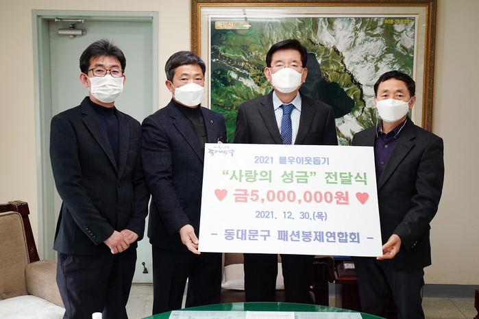 서울 동대문구는 최근 동대문구 패션봉제연합회로부터 코로나19 등으로 어려움을 겪고 있는 이웃을 돕기 위한 따뜻한 겨울나기 성금 500만원을 기탁받았다. 사진은 전달식에서 유덕열 구청장(오른쪽 두 번째)과 관계자들이 기념촬영을 하고 있는 모습. (사진제공=동대문구청)
