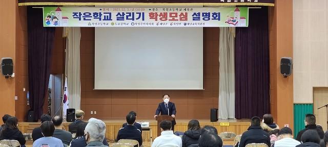 따뜻한 햇살로 가득했던 지난 3일(금), 전라남도해남교육지원청(교육장 조영천)은 북일초등학교에서 해남군(명현관), 북일면주민자치회(신평호), 전라남도해남교육지원청, 북일초, 두륜중학교 등과 합심해 “작은학교 살리기 학생모심 설명회”를 개최했다.