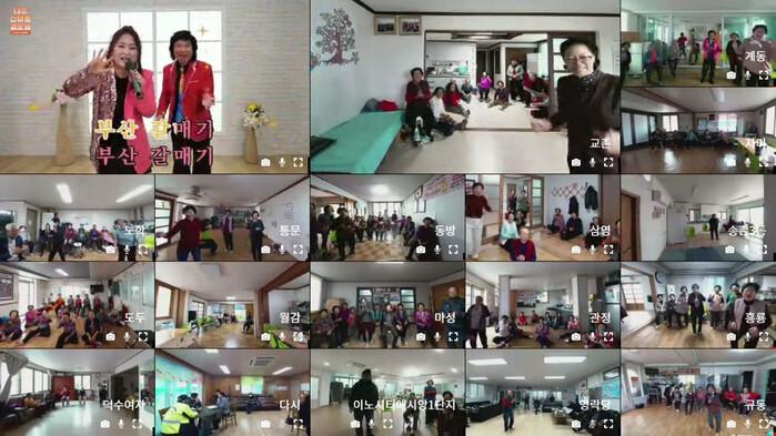 | ▲ 나주시 20개 스마트 경로당이 실시간으로 연결되어 어르신들이 함께 노래 교실에 참여하고 있다. (출처=나우비긴) |