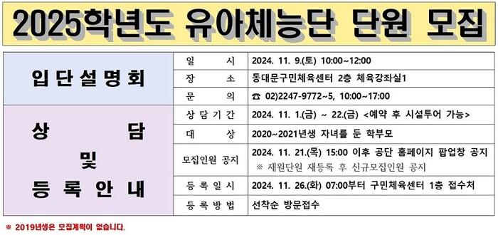 [시민일보 = 이대우 기자] 동대문구시설관리공단(이사장 인택환)에서 운영하는 동대문구민체육센터가 2025학년도 유아체능단 신입단원을 모집한다.