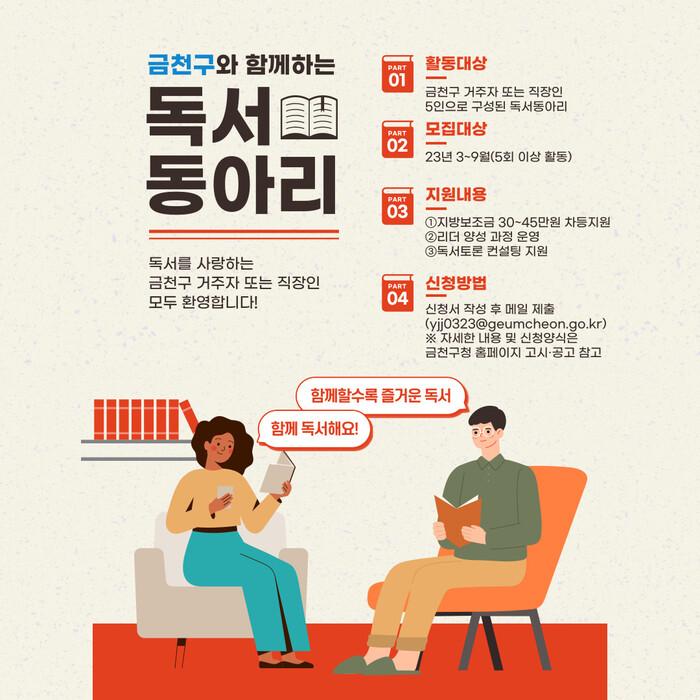 [시민일보 = 여영준 기자] 금천구(구청장 유성훈)는 동네방네 ‘책 읽는 도시 금천 활성화’를 위해 오는 7일까지 독서동아리를 모집한다고 밝혔다.