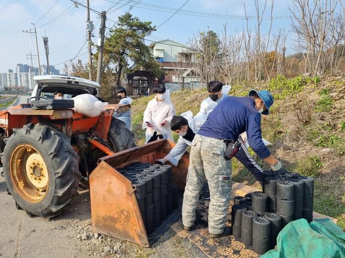경기 의정부시 용현동 사랑과평화의교회 중고등부 학생들이 지난 14일 송산1동 취약계층 노인가구를 직접 방문해 연탄 1000장을 배달 봉사하고 백미 20kg를 함께 전달했다. 사진은 이날 봉사에 참여한 학생들이 연탄을 배달하고 있는 모습. (사진제공=의정부시청)