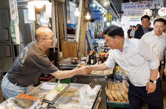 ▲ 지난 7월 아현시장에 방문해 상인의 의견을 청취하고 격려하는 박강수 마포구청장. (사진=마포구청 제공) |