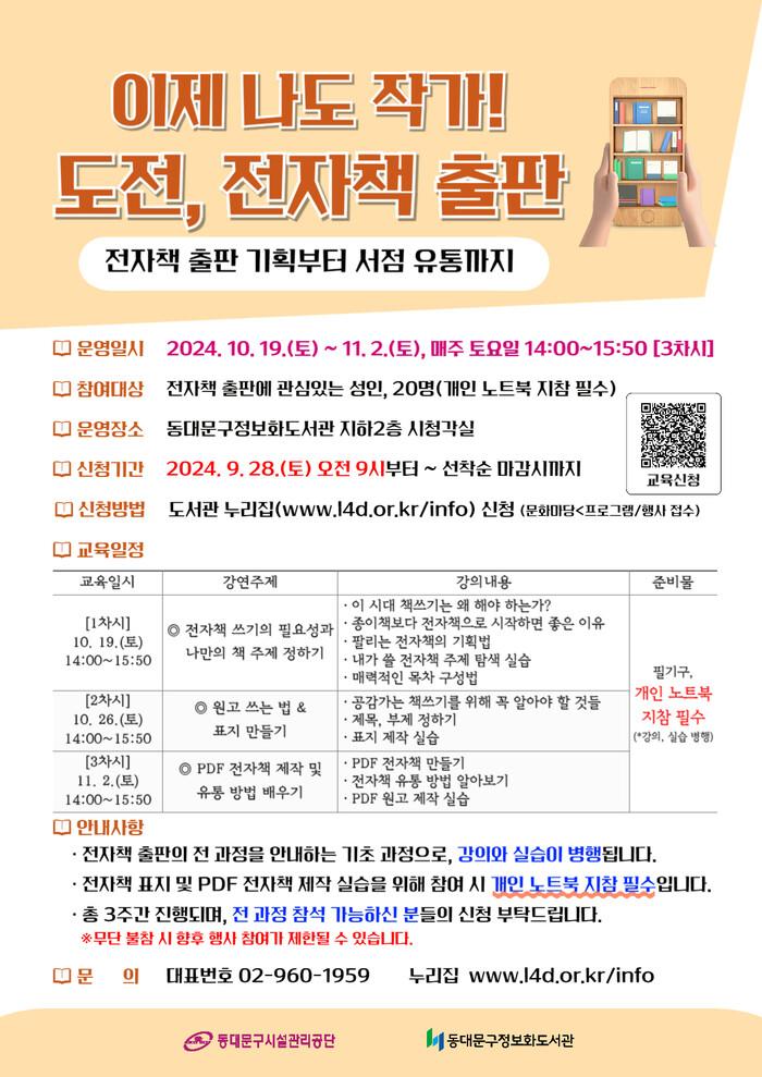 “이제 나도 작가! 도전, 전자책 출판”은 자신만의 도서 콘텐츠를 발굴하고 전자책 제작에 필요한 기초 과정을 배울 수 있는 교육이다. 전자책 기획부터 제작·서점 유통까지 전자책 출판의 전 과정을 이해하고, 공감 가는 글쓰기방법·전자책 표지와 PDF 전자책 제작 방법 등 강의와 실습이 병행되며 진행된다.