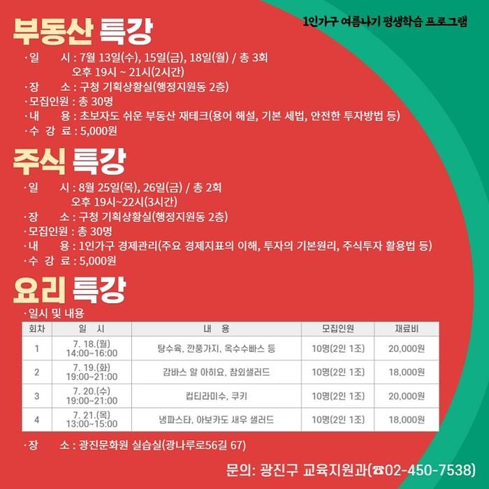 [시민일보 = 여영준 기자] 서울 광진구(구청장 김경호)는 올 여름 1인 가구의 건강한 독립을 지원하기 위해 맞춤형 평생교육 프로그램을 운영한다고 밝혔다.