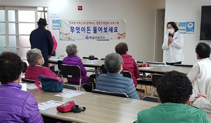 경기 하남시 보건소가 오는 12월까지 홀몸노인과 경로당 등을 대상으로 직접 방문해 감염병·만성질환 등의 예방·관리법 교육 및 혈압과 혈당·건강상태도 체크해주는 ‘무엇이든 물어보세요’ 프로그램을 운영한다. 사진은 최근 지역내 경로당에서 프로그램이 진행되고 있는 모습. (사진제공=하남시청)