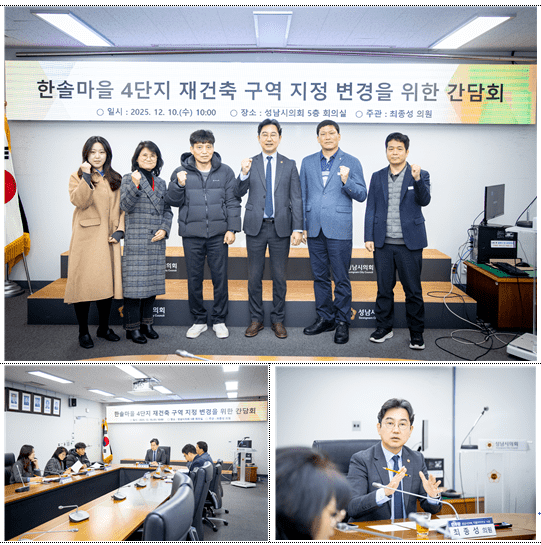 [성남=오왕석 기자] 성남시의회 더불어민주당 최종성 의원(분당,수내3,정자2·3,구미)은 12월 10일(수) 성남시의회 5층 회의실에서 ‘한솔마을 4단지 재건축 구역 지정 변경 간담회’를 개최했다고 밝혔다.