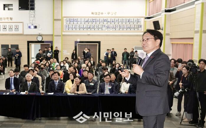 | ▲ 강기정 광주광역시장이 19일 광산구청 윤상원홀에서 광주 군공항 이전 주민설명회에 참석해 민·군공항 통합이전 사업의 최근 추진 상황과 향후 계획을 설명하고 있다. /광주광역시 제공 |