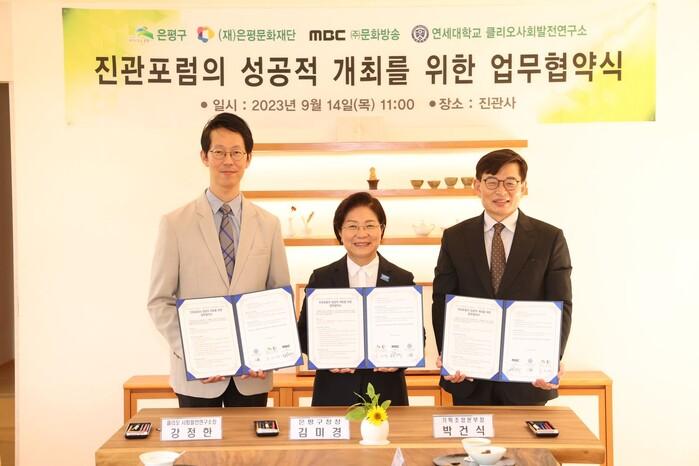 [시민일보 = 이대우 기자] 은평구(구청장 김미경)가 최근 진관포럼(가칭)의 성공적 개최를 위해 은평문화재단, ㈜문화방송, 연세대학교 클리오사회발전연구소 관계자들이 참석한 가운데 업무협약을 체결했다.