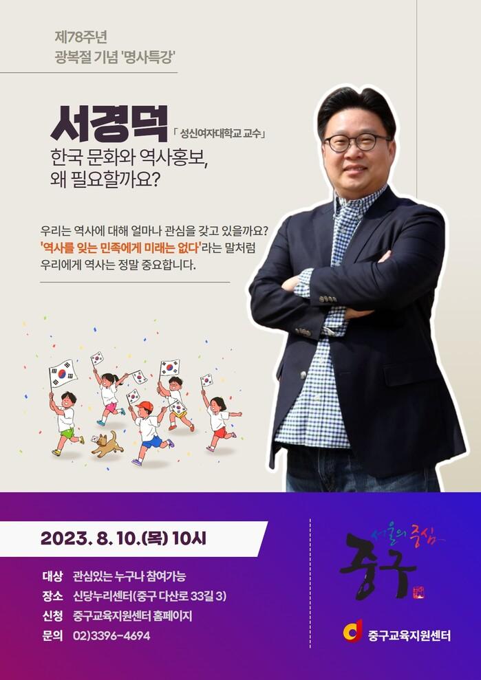 우선, 구는 광복절을 앞두고 역사 바로 알기 특강을 개최한다. 성신여자대학교 서경덕 교수가 ‘한국문화와 역사홍보, 왜 필요할까요?’를 주제로 신당누리센터에서 10일 오전 10시~낮 12시 강연을 진행한다.