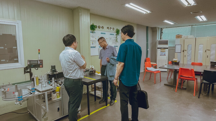 | ▲ 사진 설명: 2025년에 생산레벨업 지원사업에 참가한 기업의 현장을 점검하는 경과원 관계자들 |