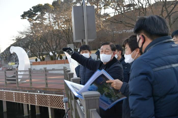 황선봉 충남 예산군수가 새해 경제 분야 첫 현장행보로 지난 5일 중소기업 및 예산제2일반산업단지 조성 현장을, 6일 예당호권역 관광개발사업현장을 방문해 현장 근로자를 격려하고 기업의 애로사항을 청취했다. 사진은 6일 황 군수가 예당호권역 관광개발사업현장을 점검하고 있는 모습. (사진제공=예산군청)