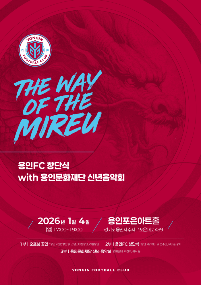 이번 창단식은 용인시가 명실상부한 축구도시로 도약하는 역사적 출발점이자, 시민과 함께 만들어갈 ‘용인FC 시대’의 서막을 알리는 상징적 무대다. 행사는 용인문화재단 신년음악회와 연계해 진행되며, 이상일 용인특례시장을 비롯해 구단 관계자와 축구계 인사 그리고 각계각층의 주요 인사들과 시민들이 함께 자리한다.