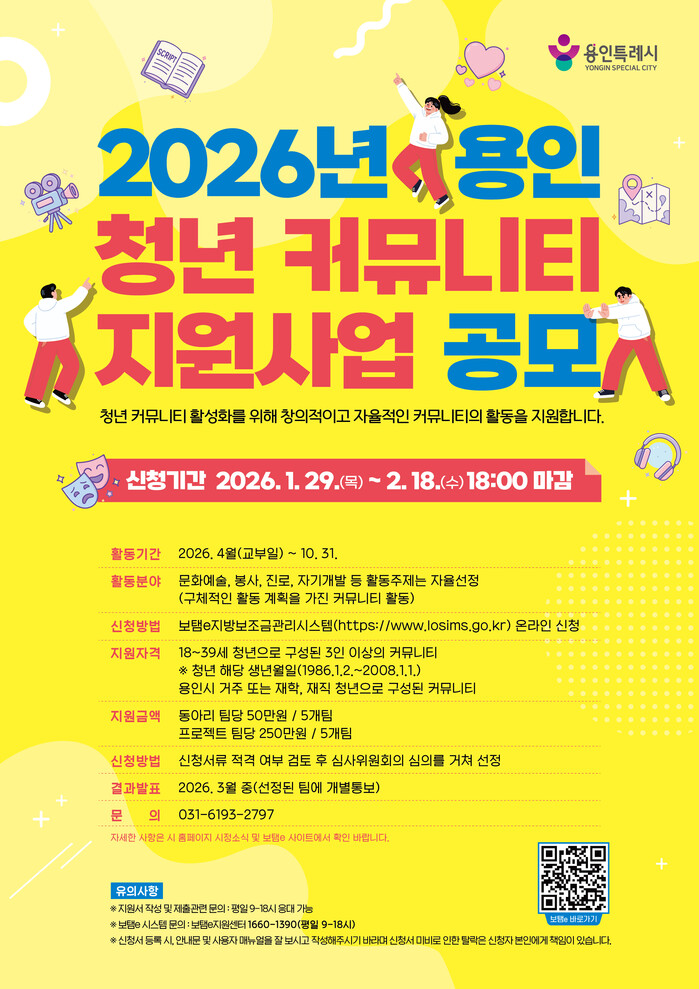 [용인=오왕석 기자] 용인특례시(시장 이상일)는 2월 18일까지 ‘청년 커뮤니티 지원사업’에 참여할 10개 팀을 모집한다고 29일 밝혔다.