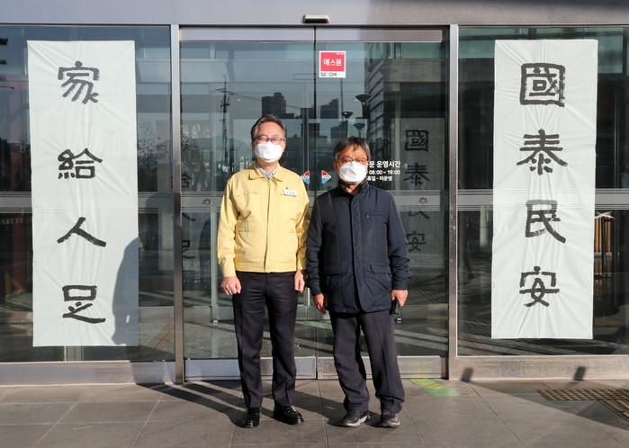 서울 금천구가 지난 4일 입춘을 맞이해 구청사 입구에 구민의 안녕을 기원하는 입춘첩을 부착했다. 이번 입춘첩은 안희찬 금천역사포럼 명예회장이 ‘국태민안 가급인족(國泰民安 家給人足)’으로 문구를 작성해 기증했다. 사진은 유성훈 구청장(왼쪽)이 안 회장과 기념촬영을 하고 있는 모습.(사진제공=금천구청)