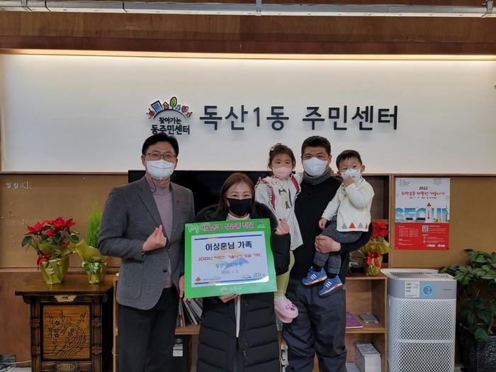 서울 금천구 독산1동 주민센터가 최근 독산1동에 거주하는 이상훈씨 가족으로부터 지역 저소득 아동가구를 위한 따뜻한 겨울나기 성금 200만원을 기탁받았다. 성금은 기탁자의 의사에 따라 생활고에 처한 조손 또는 한부모가구에 전달될 예정이다. 사진은 전달식에서 이씨 가족과 관계자가 기념촬영을 하는 모습. (사진제공=금천구청)
