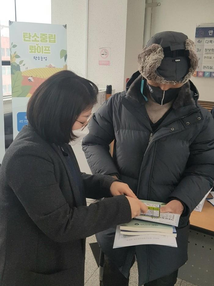 경기 양평군 서종면은 최근 복지사각지대 제로화를 위해 2022년 새해 농업인 실용교육에 참석한 지역 주민에게 복지사각지대 발굴을 위한 홍보 활동을 펼쳤다. 사진은 이날 면 관계자가 주민에게 홍보 물품을 나눠주고 있는 모습. (사진제공=양평군청)