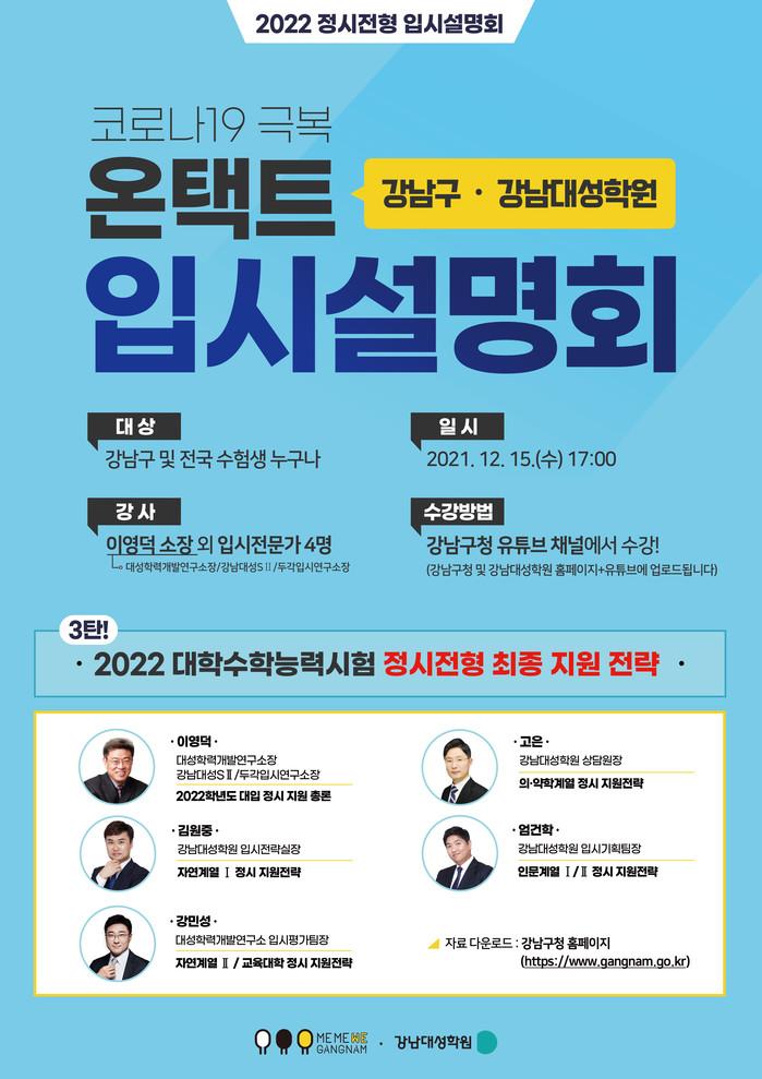 [시민일보 = 이대우 기자] 서울 강남구(구청장 정순균)가 2022학년도 대학수학능력시험을 마친 수험생과 학부모를 대상으로 ‘대학입시 정시전형 입시설명회’를 오는 13~15일 온라인에서 진행한다.