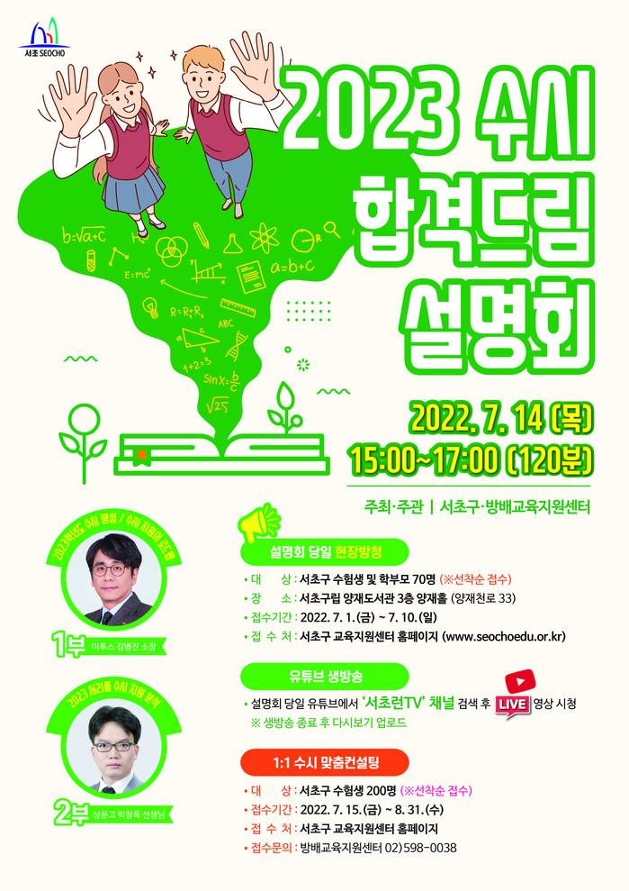 [시민일보 = 이대우 기자] 서울 서초구(구청장 전성수)가 오는 14일, 수험생과 학부모의 대입 수시에 대한 여러 궁금증 해결을 위해 서초구립 양재도서관에서 ‘2023 수시 합격드림 설명회’를 개최한다.