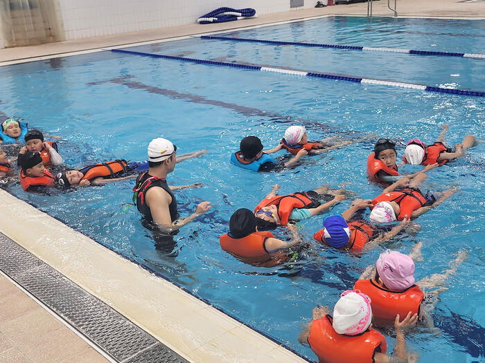 주요 교육 내용으로는 ▲수영장 안전교육 및 재난대피 훈련 ▲물 적응 및 호흡훈련 ▲생존뜨기 및 체온 유지법 ▲수중 이동 및 구조 기초활동 등이 진행되며, 실제 위기 상황에서 필요한 대응 능력을 단계적으로 익힐 수 있도록 구성했다.