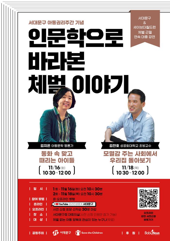 [시민일보 = 홍덕표 기자] 서울 서대문구(구청장 문석진)가 11월 셋째 주 아동권리주간을 기념해 국제구호개발NGO 세이브더칠드런과 함께 '인문학으로 바라본 체벌 이야기'란 주제로 부모 특강을 연다고 11일 밝혔다.