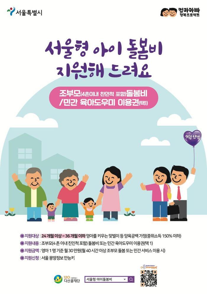 ‘서울형 아이돌봄비’란 맞벌이, 한부모 등의 이유로 부모가 직접 아이를 돌보기 어려워 조부모나 삼촌, 이모, 고모 등 영아 기준 4촌 이내의 친인척 또는 민간 육아도우미의 돌봄 지원을 받는 양육 공백 가정을 지원하기 위해 마련된 사업이다.