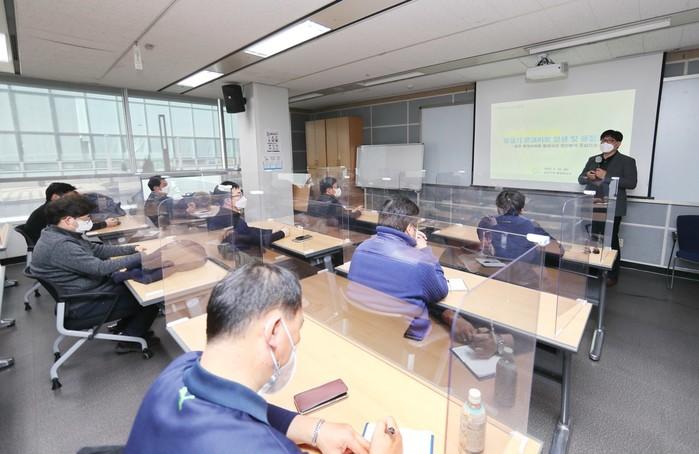 서울 금천구가 18일 대형공사장 현장소장 및 감리단장 20명을 대상으로 ‘건축공사장 품질 및 안전관리 교육’을 실시했으며, 광주시 아파트공사 외벽붕괴사고 관련 겨울철 콘크리트 등 습식공사 품질관리에 대해 강조했다. 사진은 이날 건축공사장 품질 및 안전관리 교육이 진행되고 있는 모습. (사진제공=금천구청)