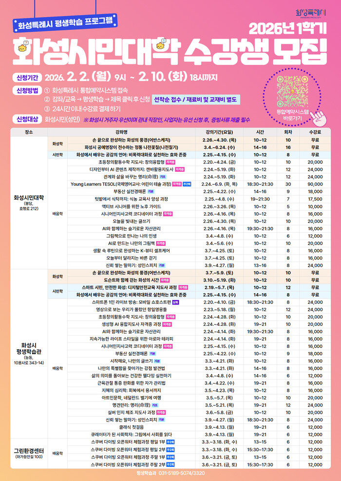 | ▲ 2026년 1학기 화성시민대학 수강생 모집 안내문 /자료제공=화성특례시 |
