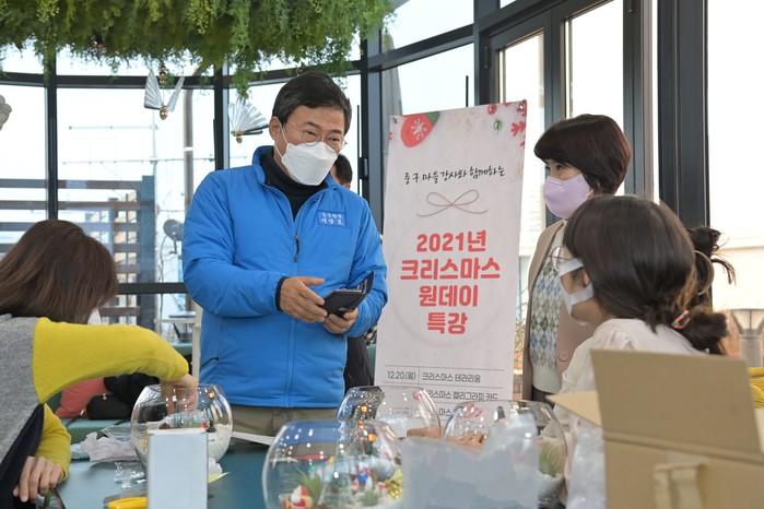 | ▲ 크리스마스 원데이 특강에 함께한 서양호 구청장이 참여자들과 이야기를 나누고 있다.(사진제공=중구청) |