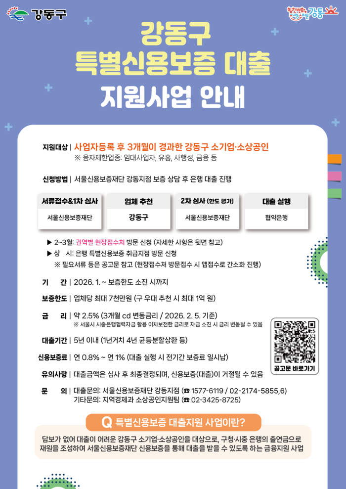 지원 대상은 강동구에 사업자 등록을 한 지 3개월이 지난 소기업과 소상공인으로, 구의 추천을 받으면 업체당 최대 7000만원까지, 지역사회 기여 등으로 우대 추천을 받을 경우 최대 1억원까지 보증 대출을 신청할 수 있다. 서울시 협력 자금으로 대출을 받을 경우, 상환 기간은 최대 5년(1년 거치 후 4년 분할 상환 등 선택 가능)이며, 금리는 연 2.6% 수준의 변동 금리(2026. 4. 2. 기준)이다.