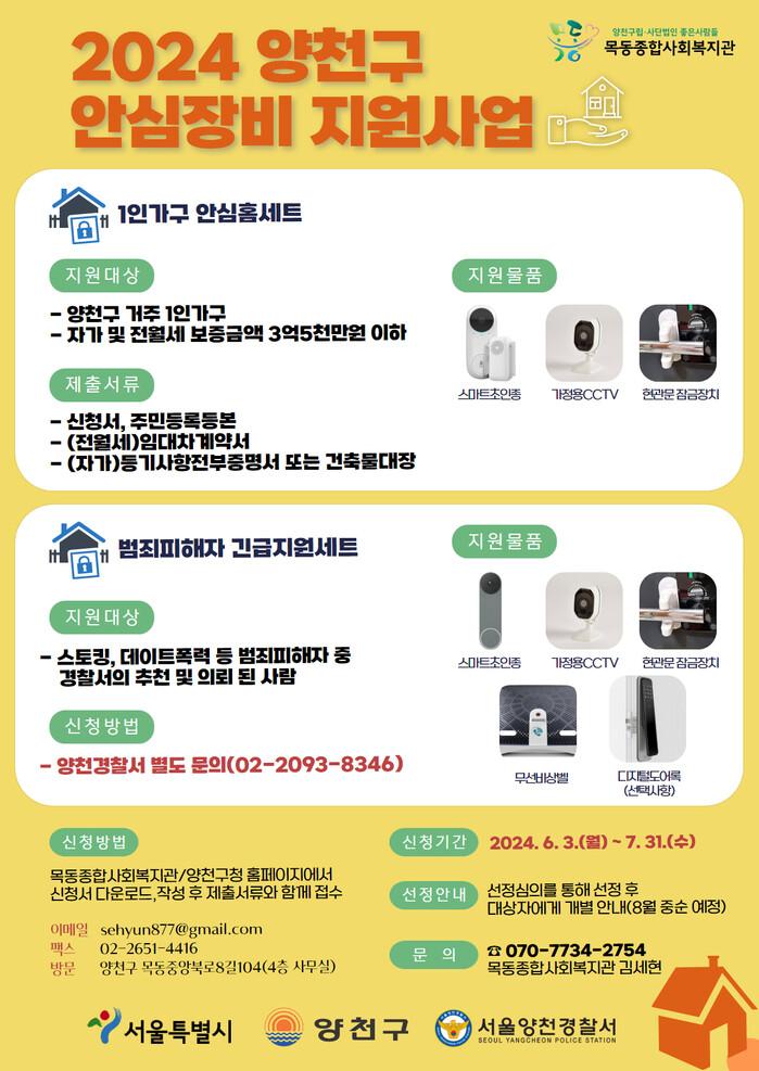 이기재 구청장은 “이번 안심장비 지원 사업을 통해 안전 취약계층의 불안감을 덜고, 안심할 수 있는 주거환경을 제공하고자 한다”면서 “더 많은 가구가 혜택을 받을 수 있도록 지원 조건을 완화하고, 다양한 주거 유형을 포괄하게 됐으니 관심 있는 분들의 많은 신청바라며, 구민의 안전이 일상이되는 안심도시 양천구를 위해 최선을 다하겠다”고 말했다.