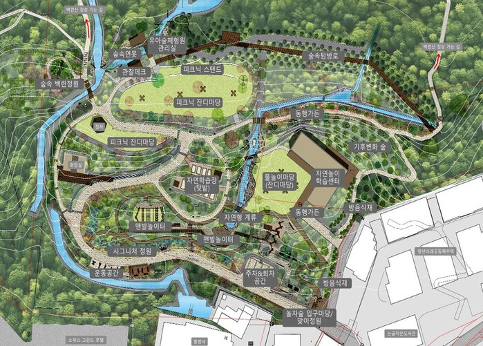 9일 구에 따르면 놀자숲은 서울시의 ‘2023년 백련근린공원 테마형 복합힐링공원 조성 기본계획’에 근거해 시비 12억5500만원을 투입해 조성되는 것으로, 기존 무허가 건물을 철거하고 피크닉 잔디마당, 자연학습장, 물놀이마당, 맨발놀이터 등이 만들어질 예정이다.