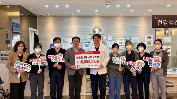 바른윤내과의원은 그동안 매년 1,000만원의 성금을 꾸준히 기부해왔으며, 이번에는 ‘복지사각지대 사회안전망 구축사업’을 통해 기부를 진행했다. 이 사업은 지역연계모금 협약사업의 일환으로, 의료지원 또는 주거환경 개선지원이 필요한 저소득 가구에 실질적인 도움을 주기 위해 진행되는 사업이다.