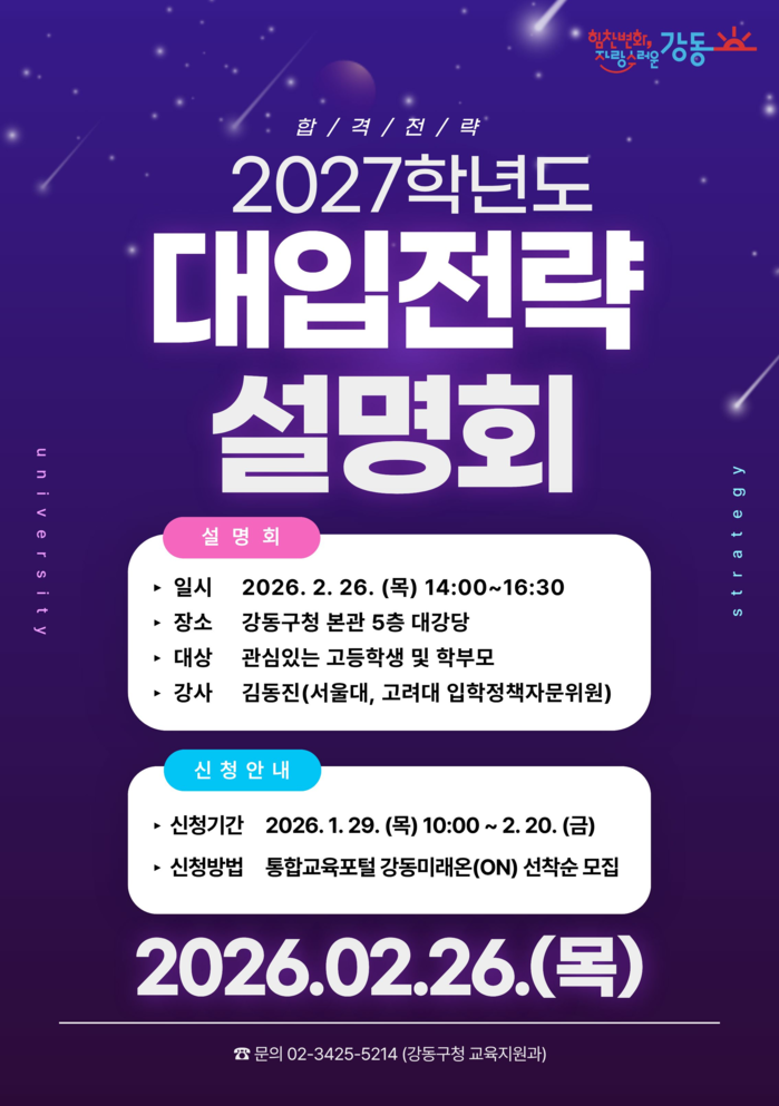 [시민일보 = 이대우 기자] 서울 강동구(구청장 이수희)가 오는 2월26일 올해 첫 대입전략설명회를 구청 5층 대강당에서 개최한다.
