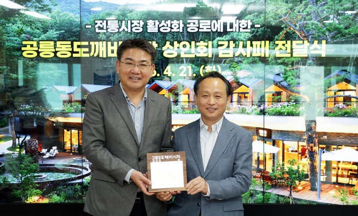 오승록 서울 노원구청장이 21일 오전 공릉동도깨비시장 상인회로부터 감사패를 전달받았다. 이날 상인회는 구청장실에서 전통시장 활성화에 기여한 공로로 오 구청장에게 118명의 회원, 118개 점포의 마음을 담아 감사패를 전달했다. 사진은 오 구청장(왼쪽)이 관계자와 기념 촬영하는 모습. (사진=노원구청 제공)