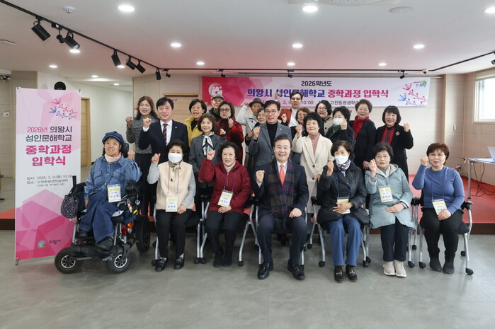 | ▲ 김성제 의왕시장이 ‘2026학년도 의왕시 성인문해교육 중학과정 입학식’참석자들과 기념 촬영을 하고 있다 /사진제공=의왕시 |