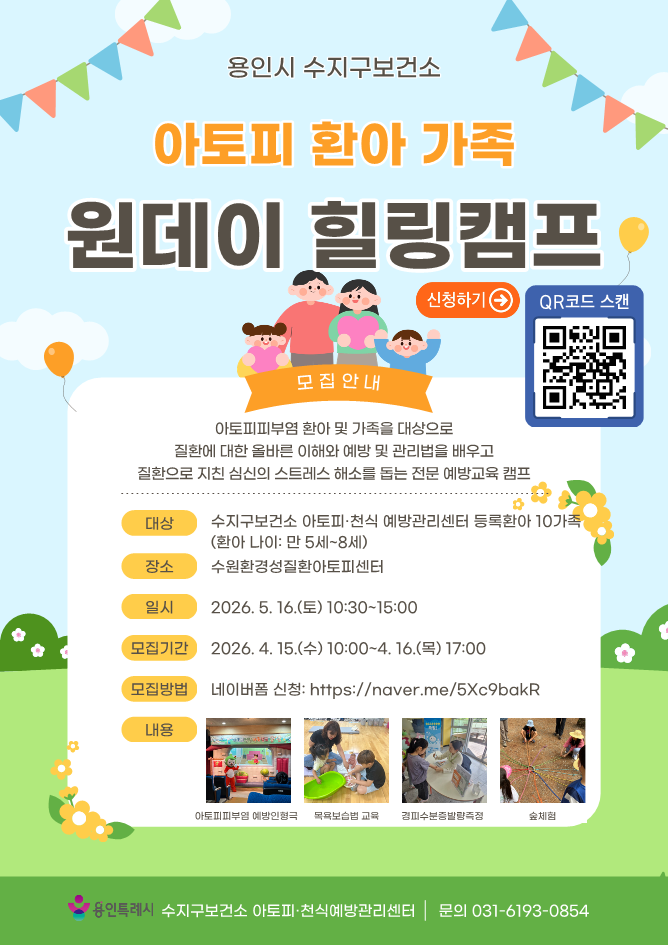 [용인=오왕석 기자] 용인특례시(시장 이상일) 아토피·천식 예방관리센터는 아토피피부염 환아와 가족을 위한 ‘아토피 환아 가족 원데이 힐링캠프’ 참가자를 모집한다고 15일 밝혔다.