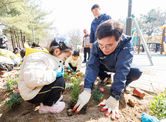| ▲ 진교훈 구청장(오른쪽)이 방화근린공원에서 열린 ‘제81회 식목일 나무 심기 행사’에서 아이들과 꽃을 심고 있다. (사진=강서구청 제공) |