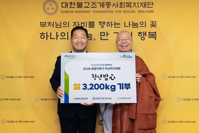 | ▲ 23일 대한불교조계종사회복지재단에서 NH농협은행 임영섭 스포츠단장(왼쪽)과 대한불교조계종사회복지재단 대표이사 도륜스님(오른쪽)이 기념촬영을 하고 있다. (사진=NH농협은행 제공) |
