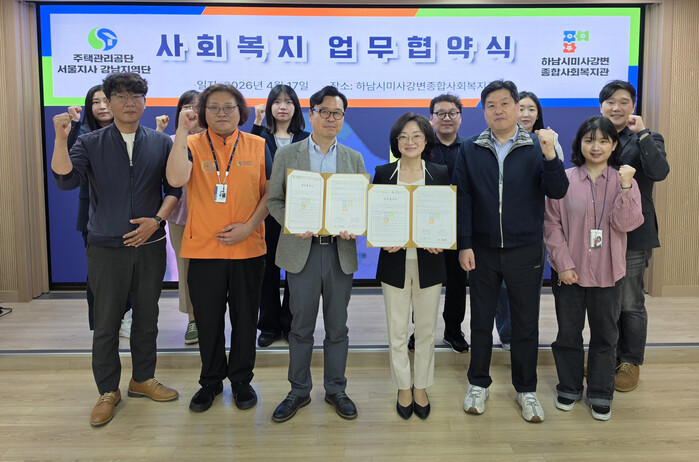 경기 하남시 미사강변종합사회복지관이 최근 지역내 취약계층의 생활 안정과 자립 지원을 위해 주택관리공단 서울지사 강남지역단과 업무협약을 체결했다. 사진은 협약식에서 관계자들이 기념 촬영을 하는 모습. (사진=하남시미사강변종합사회복지관 제공)