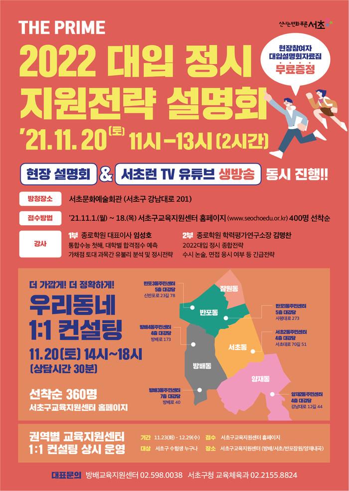 [시민일보 = 이대우 기자] 서울 서초구가 양재동 서초문화예술회관에서 고3 수험생들과 학부모 등을 대상으로 ‘THE PRIME 2022 대입 정시 지원전략 설명회를 오는 20일 오전 11시에 연다.
