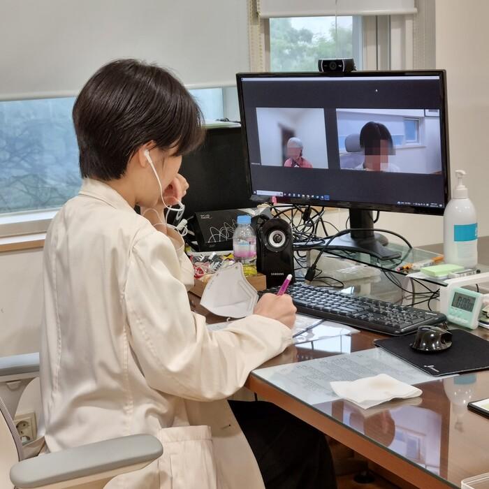 | ▲ 치매안심센터에서 치매환자와 비대면 상담을 하고 있는 의사(사진=강남구청 제공) |